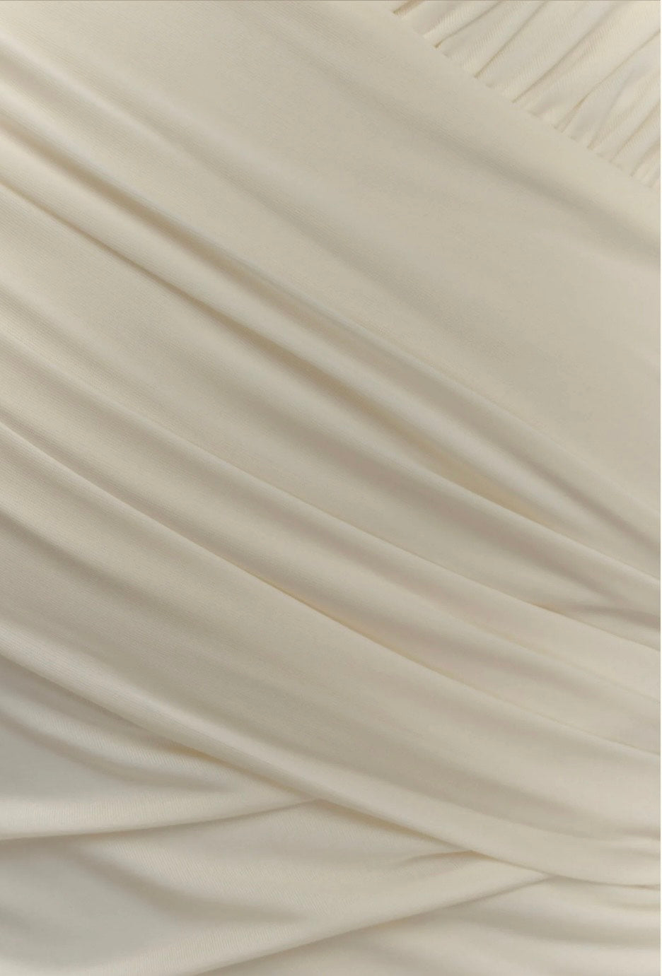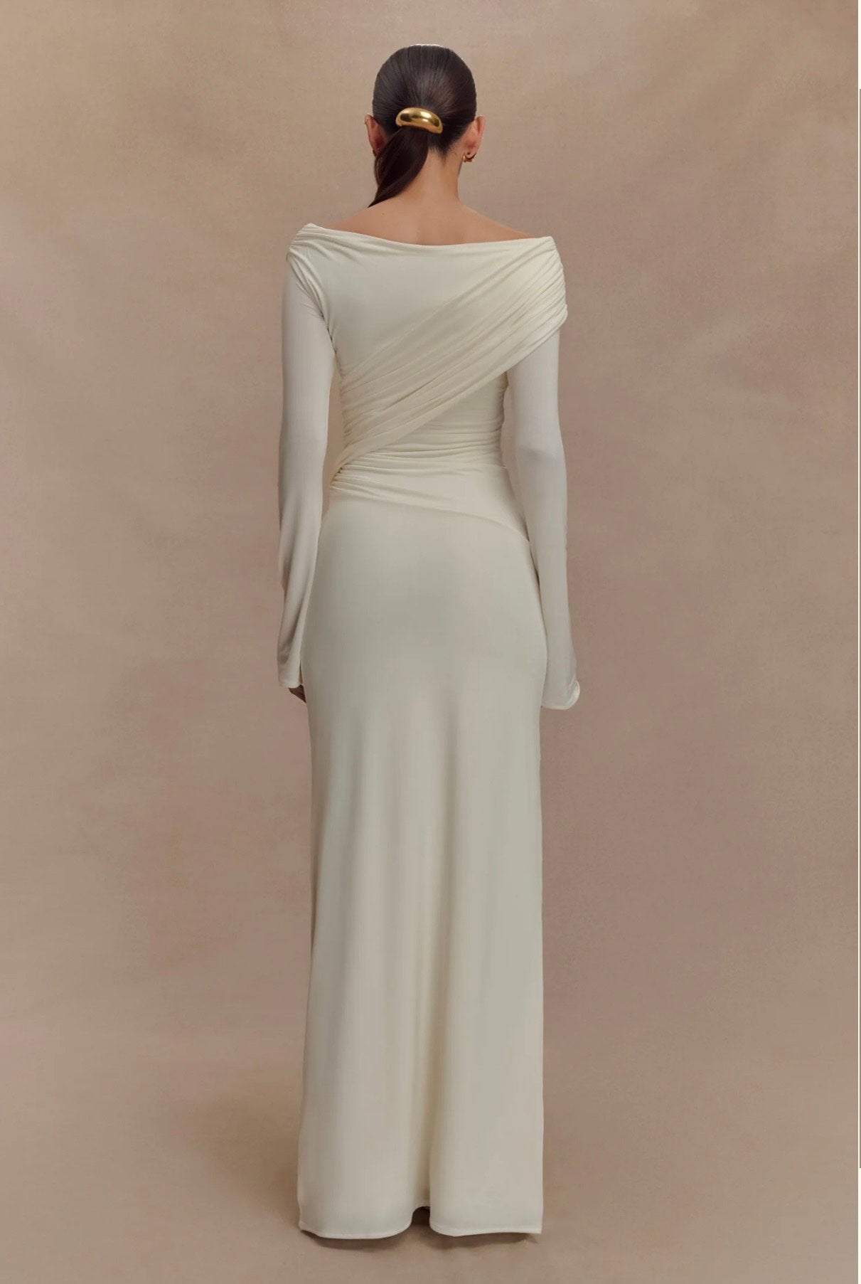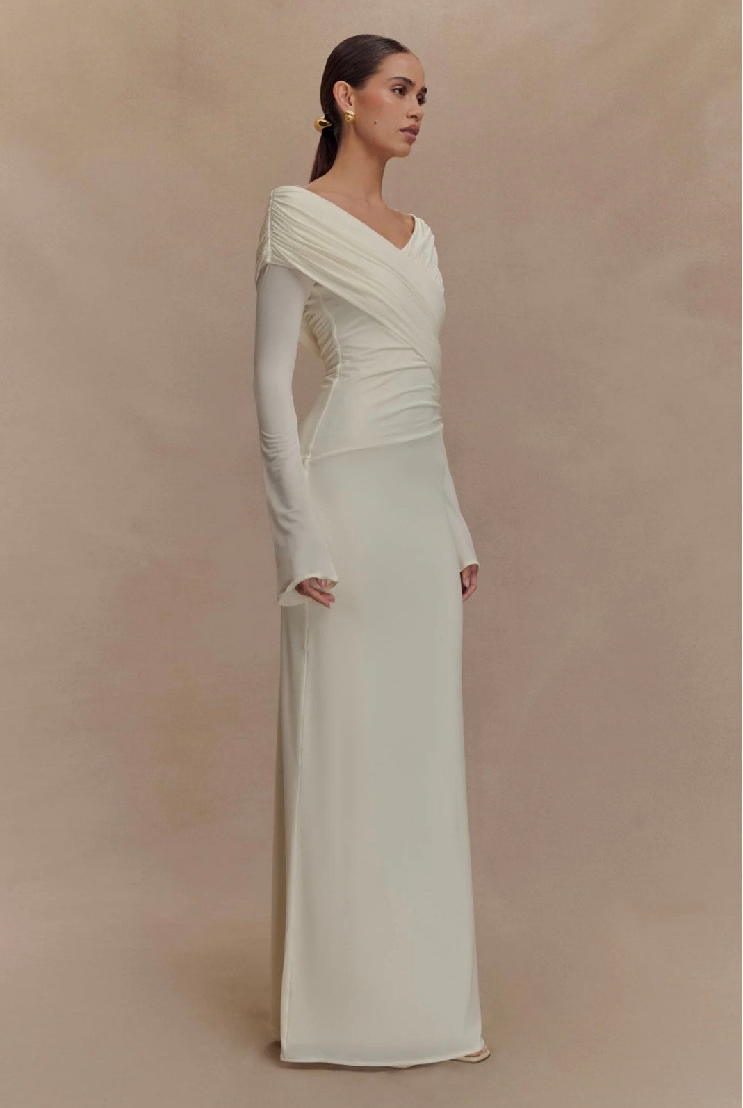 The THERESE Off Shoulder Ruched Maxi Dress is a refined take on modern glamour. Designed with a flattering off-shoulder neckline and long sleeves, this fully lined maxi dress hugs the body with a sleek, fitted silhouette. Delicate ruched detailing along the shoulders adds texture and softness, creating a look that’s both romantic and confident. Perfect for evening occasions, formal events, or celebrations that call for effortless sophistication.